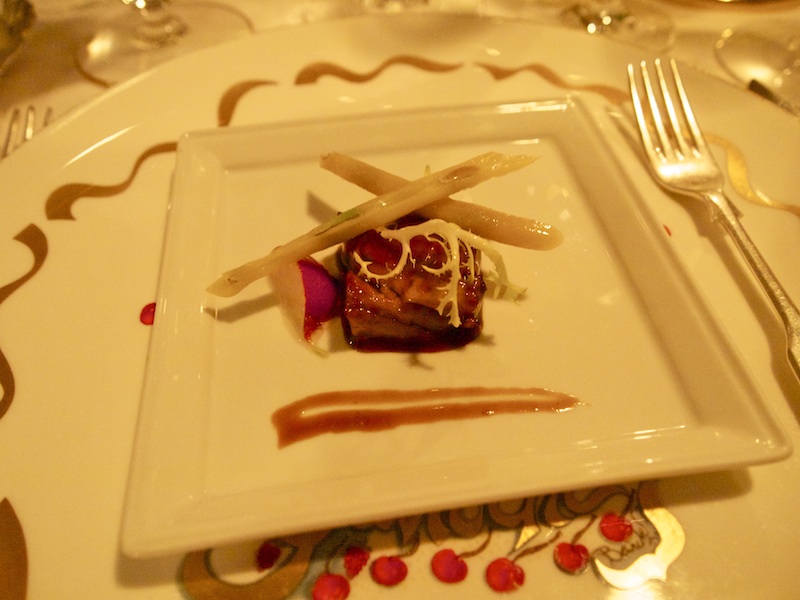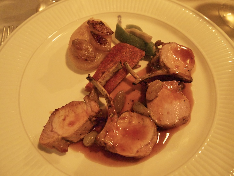 Main course, Roast suckling pig with crackling, peppered sauce, golden raisins, confit shallots and potato. A perfectly roasted rack of pork that was carved tableside into eight chops, four for me and four for one of my table companions. The meat was slightly pink and tender, delicious. With the pork came this marvellous well-reduced peppered jus with some lovely boozy raisins in it; nice elegant heat from the pepper. The confit shallots were meltingly soft and sweet and had a wonderfully sticky outside. Confit potato: well what can I say, what's not to like about potatoes slowly cooked in duck fat. Great crackling too. This was a truly divine pork dish that was perfectly executed.